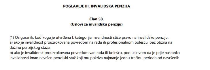 U Zakonu o penzijskom i invalidskom osiguranju stoji da osiguranik, kod koga je utvrđena prva kategorija invalidnosti, stječe pravo na invalidsku penziju ako je invalidnost prouzrokovana povredom van rada ili bolešću, pod uvjetom da je prije nastanka invalidnosti imao navršen penzijski staž koji mu pokriva najmanje jednu trećinu perioda od navršenih najmanje 20 godina života do dana nastanka invalidnosti.
