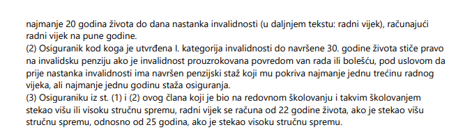 Zatim, osoba kod koje je utvrđena prva kategorija invalidnosti do navršene 30. godine života, stječe pravo na invalidsku penziju ako je invalidnost prouzrokovana povredom van rada ili bolešću, pod uvjetom da prije nastanka invalidnosti ima navršen penzijski staž koji mu pokriva najmanje jednu trećinu radnog vijeka, ali najmanje jednu godinu staža osiguranja.