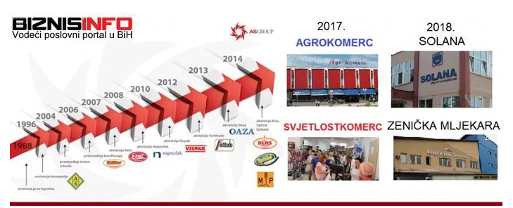 AS Group 2013. godine preuzima vodu Oaza, od koje također pravi veliki domaći brend, a potom slijedi prelomna godina, 2014., kada tešanjska firma preuzima sarajevske gigante Klas i Sprind, kao i Mlin i pekare Ljubače i time postaju jedan od lidera u proizvodnji hrane na domaćem tržištu.