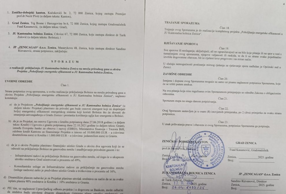 Danas su premijer ZDK Nezir Pivić i direktor JU Kantonalna bolnica Zenica Tarik Zulović uredno parafirali Sporazum o priključenju Bolnice na mrežu prirodnog gasa u okviru projekta „Poboljšanje energetske efikasnosti u JU KBZ“. Prema utvrđenoj proceduri, Sporazum će sutra u jutarnjim satima biti predat na protokol Grada Zenica, kako bi ga potpisali gradonačelnik Fuad Kasumović i direktor JP “Zenicagas”, čime se jasno potvrđuje da proces teče bez ikakvih zastoja.