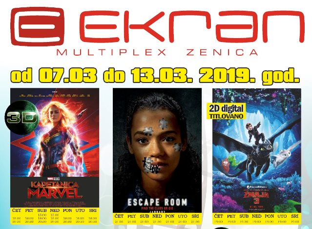 Multiplex “Ekran” Zenica će publici i naredne sedmice nuditi itekako bogat filmski program. Naime, iz studija Marvel stiže nam potpuno nova avantura iz do sada neotkrivenog perioda u historiji Marvelovog filmskog univerzuma, koja prati Kerol Denvers na putu da postane jedan od najmoćnijih heroja u univerzumu. “Kapetanica Marvel” je na programu svaki dan od 18:00 i 20:30 sati, a vikendom i od 15:00 sati. Iz studija DreamWorks Animation stiže nam epska animirana avantura o odrastanju i pronalaženju hrabrosti da se suočimo sa nepoznatim i o tome kako ne treba odustati. “Kako da dresirate svog zmaja 3” je na programu svaki dan u titlovanoj verziji, a vikendom za najmlađu publiku I sihronizovana verzija filma.