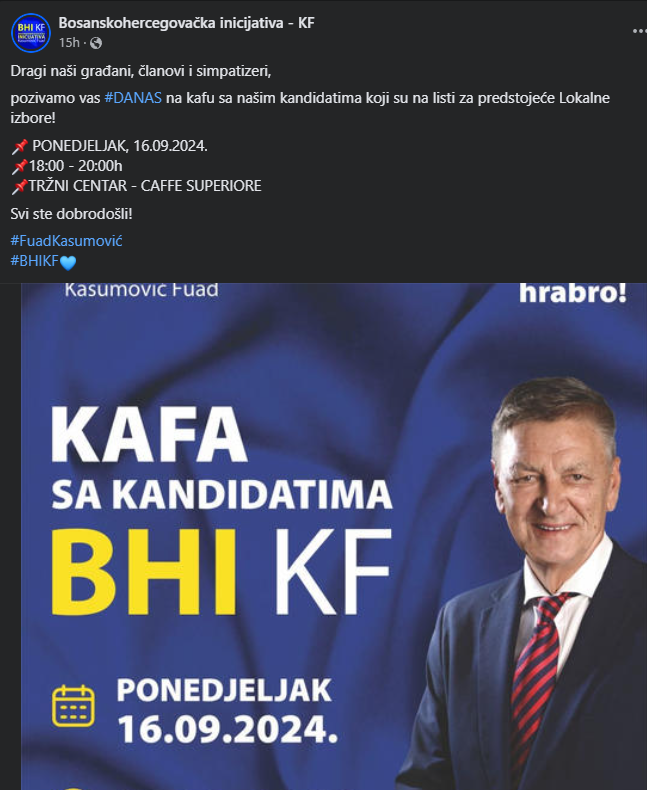 Zanimljivo je, da je stranka gradonačelnika Fuada Kasumovića, BHI KF, te “ranije preuzete obaveze najavila” tek jutros. Kako su nam potvrdili sami kandidati, OSCE ih je o ovom skupu obavjestio i počeo razgovore prije tačno mjesec dana, te sigurno nije postojala mogućnost “ranije poreuzetih obaveza”.