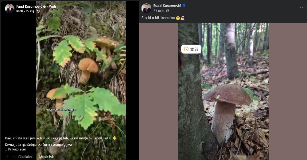 “Kažu mi da sam jutros trebao negdje biti, ali ne mogu se nešto sjetiti Divna jutarnja šetnja po šumi i branje gljiva Što bi rekli, trenutna” istakao je Kasumović.