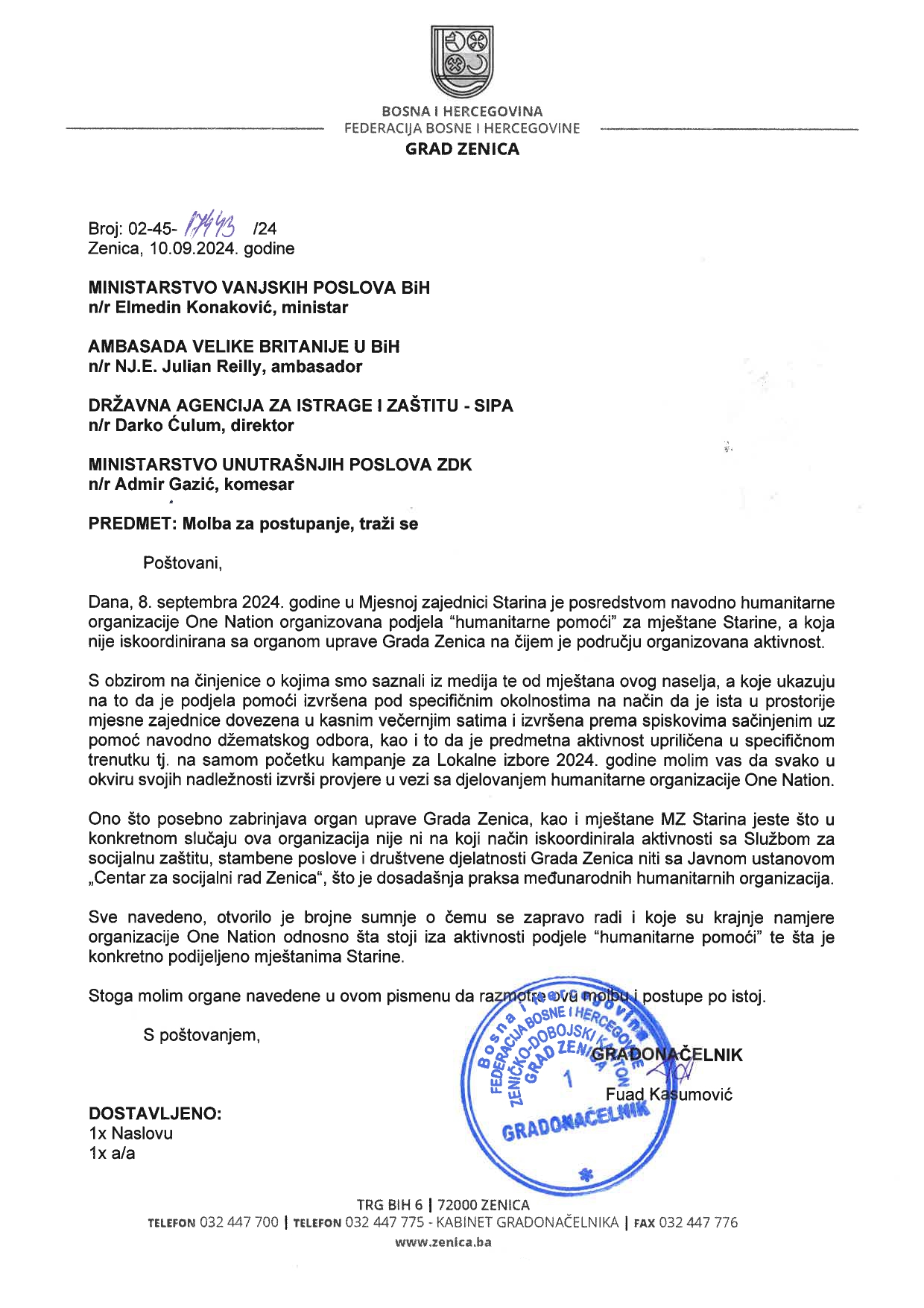 S obzirom na činjenice o kojima smo saznali iz medija te od mještana ovog naselja, a koje ukazuju na to da je podjela pomoći izvršena pod specifičnim okolnostima na način da je ista u prostorije mjesne zajednice dovezena u kasnim večernjim satima i izvršena prema spiskovima sačinjenim uz pomoć navodno džematskog odbora, kao i to da je predmetna aktivnost upriličena u specifičnom trenutku tj. na samom početku kampanje za Lokalne izbore 2024. godine molim vas da svako u okviru svojih nadležnosti izvrši provjere u vezi sa djelovanjem humanitarne organizacije One Nation.