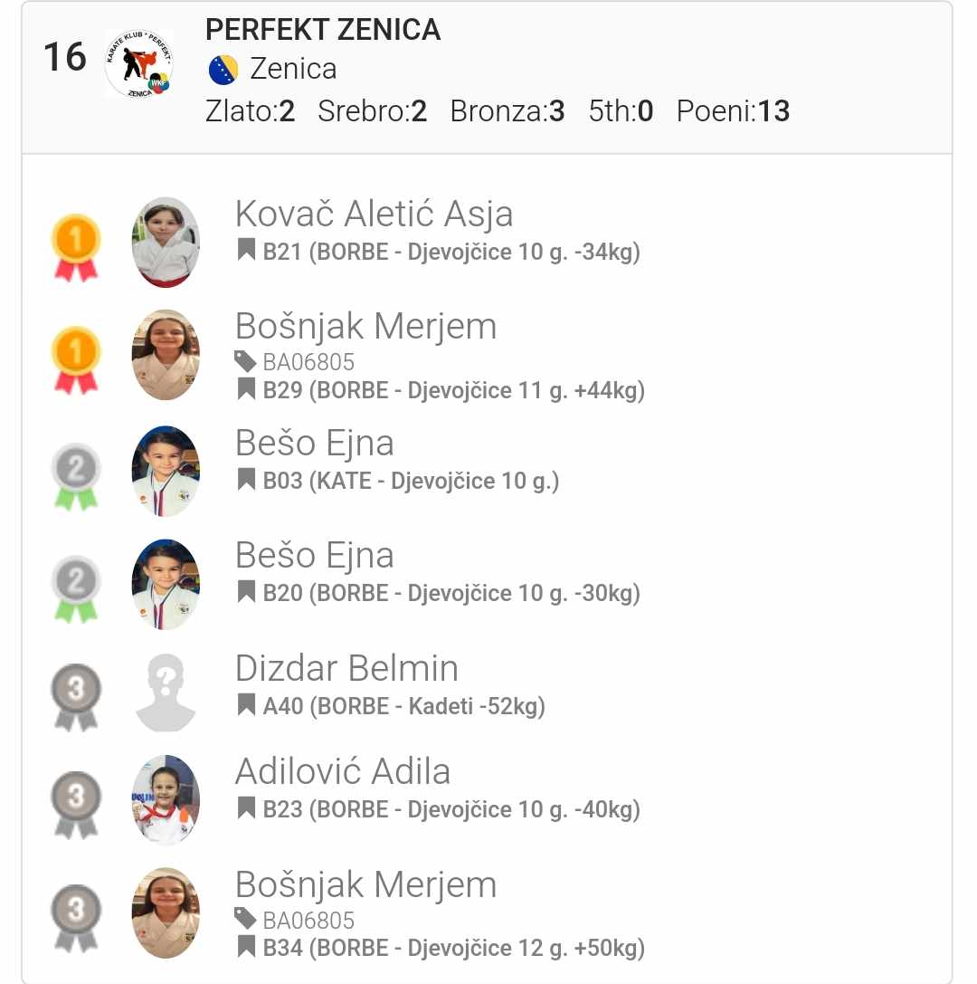 Naš Karate klub Perfekt Zenica je učestvovao sa 5 takmičara sa 12 prijava u kategorijama kate i borbe. Ukupno smo osvojili 7 medalja i to 2 zlatne, 2 srebrene i 3 bronzane medalje.