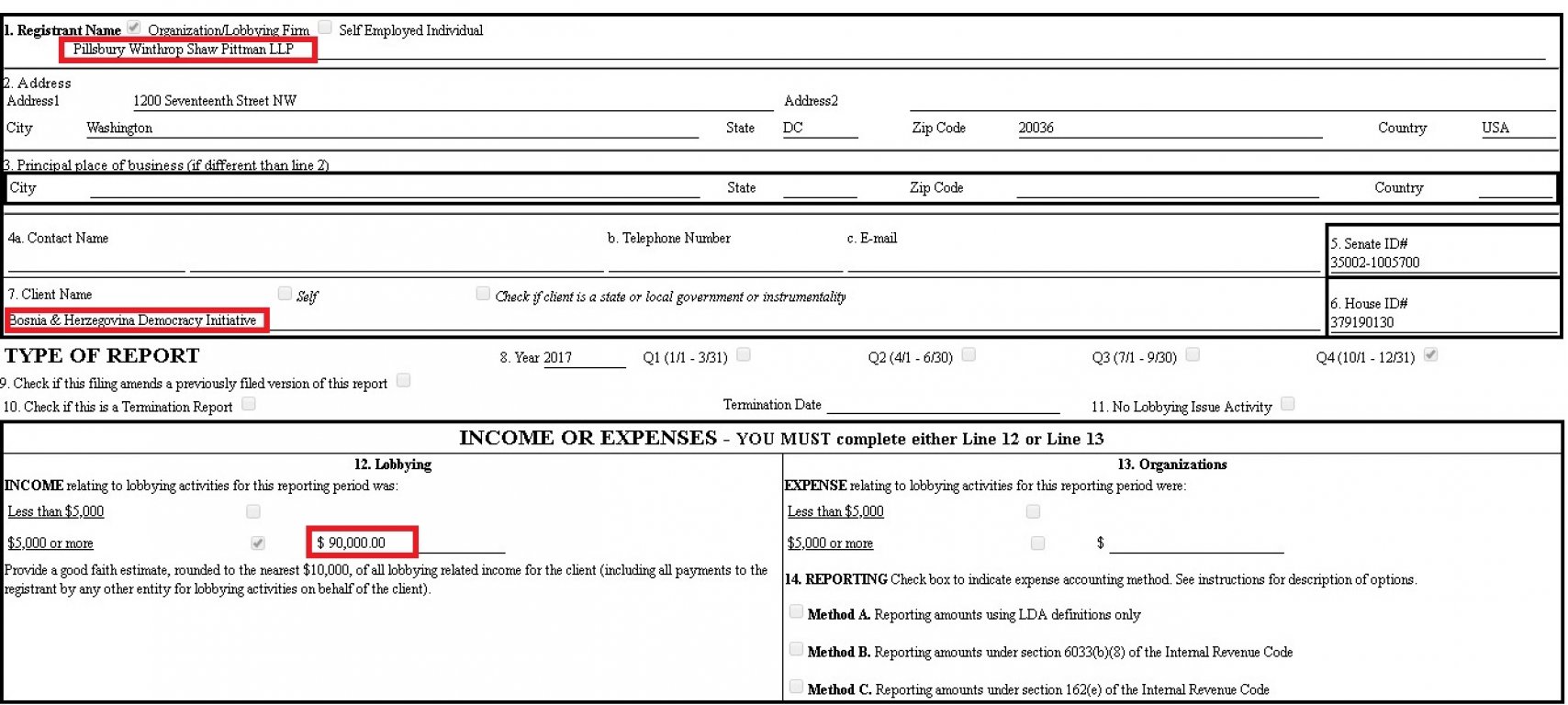 U svrhu lobiranja angažovana je ranije spomenuta lobistička kuća, u okviru koje su na konkretnom zadatku radili bivši kongresmen Greg Laughlin, te Matthew Oresman, Craig Saperstein i Brais Finch. Iz dokumenata koji su u posjedu portala Vijesti.ba vidljivo je da je ovoj lobističkoj kući BHDI već uplatio jednu tranšu u iznosu od 90 hiljada dolara.