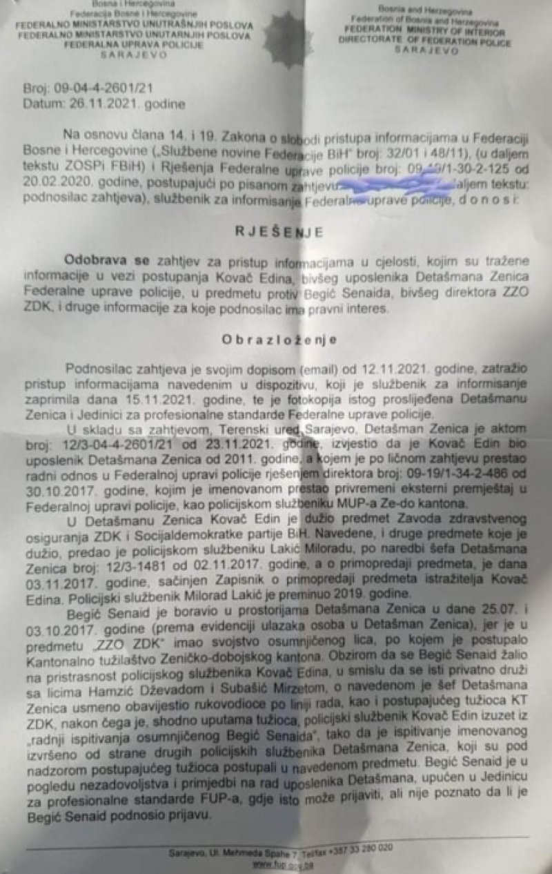 SIPA-i, Tužilaštvu BiH i FUP-u podnesena krivična prijava protiv bivšeg federalnog inspektora Edina Kovača u kojoj se navodi niz dokaza, službenih akata FUP-a i izjava nekoliko svjedoka da je zloupotrebama službenog položaja „montirao“ predmet Senaidu Begiću, bivšem direktoru ZZO ZDK