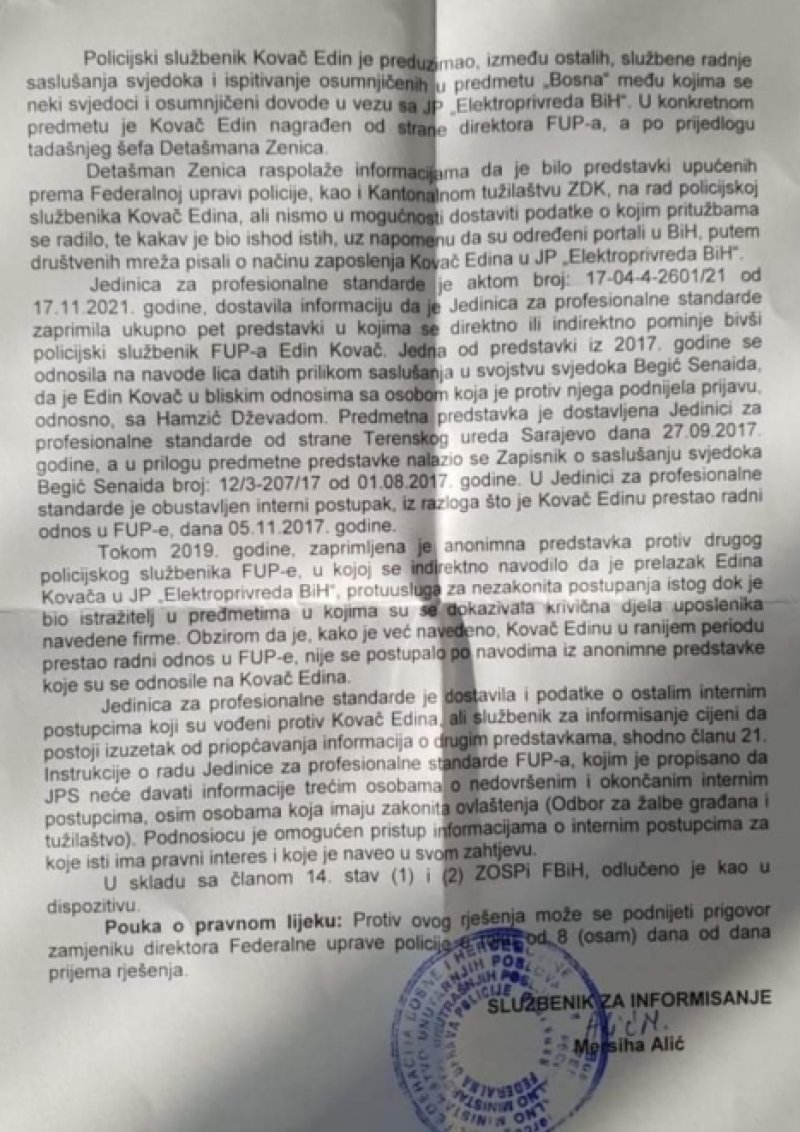 Navedeni službeni akt FUP-a u svojoj informaciji iznosi zvaničan podatak Jedinice za profesionalne standarde iz akta broj 17-04-4-2601/21 da je Jedinica zaprimila ukupno pet predstavki u kojima se direktno ili indirektno pominje bivši inspektor FUP-a Edin Kovač. Ono što je ovdje zanimljivo je obrazloženje zašto ni pored toliko prijava i predstavki protiv Kovača nije pokrenut ni jedan postupak!?