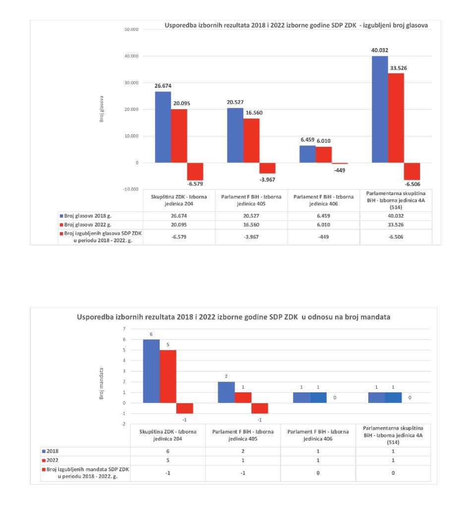 Još gori rezultati su ostvareni kada je riječ o rezultatima, glasovima i mandatima za PD Parlamenta F BiH i Parlamentarnu Skupštinu BiH. Samo u izbornoj jedinici 405 (Zenica, Žepče, Zavidovići, Maglaj, Doboj Jug, Usora i Tešanj) SDP ZDK je sa 20.527 glasova 2018.g. pao na 16.560 glasova 2022.g. tj. izgubio je 3967 glasova , odnosno sa dva direktna mandata pao je na samo jedan direktni mandat,koliko je imao i u manjoj izbornoj jedinici 406 ( Kakanj, Visoko, Breza, Olovo i Vareš ) sa ukupno osvojenih 6010 glasova. Za parlamentarnu Skupštinu BiH u izbornoj jedinici 514 ( SBK i ZDK ), zeničko-dobojski SDP je sa 40.032 glasa koliko je osvojio 2018.g. pao 2022.g. na 33.526 glasova, odnosno 6.506 glasova manje, što je bilo dovoljno za jedan mandat koliko je imao i 2018.g.