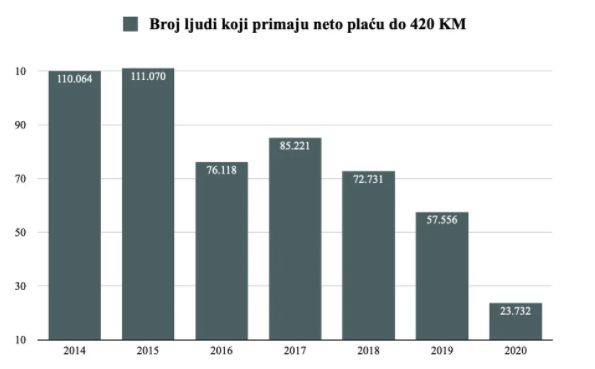 Ipak, zbunjuje nagli izlazak iz područja minimalne plaće većeg broja radnika u 2020. godini, dakle godini pandemije. S obzirom na to da zvanična statistika bilježi gubitak radnih mjesta u granama koje plaćaju niske plate, kao što su ugostiteljstvo, građevinarstvo…, da se zaključiti da je, za razliku od ranijih godina, povećan broj “izlaska” iz područja minimalne plate u 2020. godini više rezultat otpuštanja ove kategorije radnika nego rasta plata.