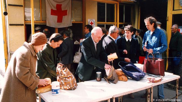 Redovi ispred javnih kuhinja. Ova fotografija je nastala u aprilu 1994. godine. Javne kuhinje u BiH i danas postoje.