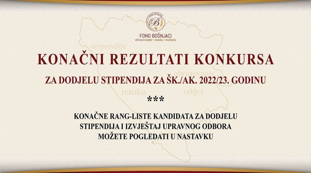Na osnovu Pravilnika o dodjeli stipendija i Odluke Upravnog odbora Fonda ”Bošnjaci” objavljen je Konkurs za dodjelu stipendija za šk./ak. 2022/23. godinu.