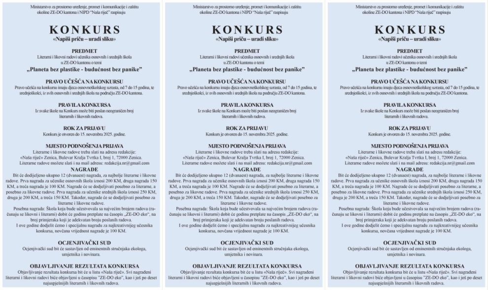 Ministarstvo za prostorno uređenje, promet i komunikacije i zaštitu okoline ZE-DO kantona i NIPD “Naša riječ” raspisuju