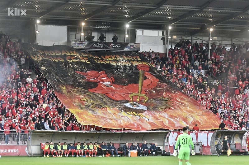Na transparentu je bio oslikan i orao iznad kojeg stoji đavo, što simbolizuje zaštitne znakove ovih navijačkih grupa.