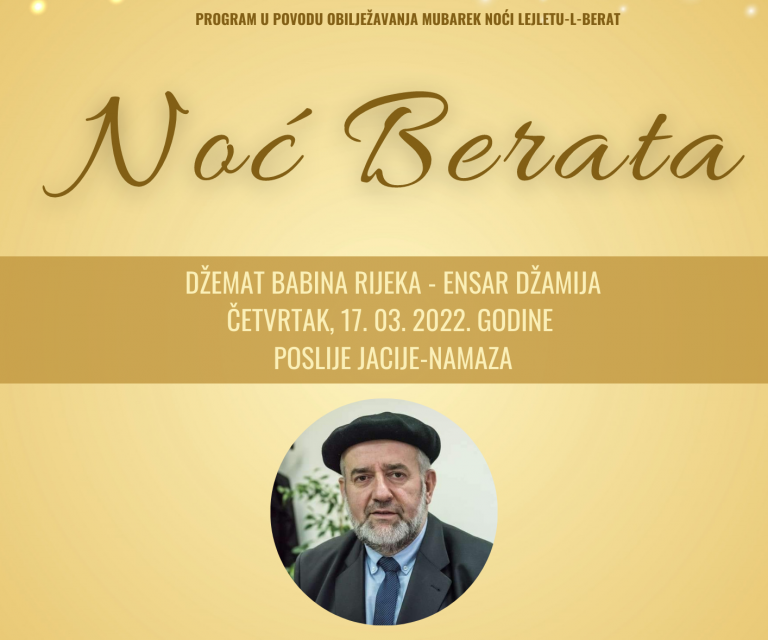 U džematu Babina Rijeka – Ensar džamija, u četvrtak 17. 03. 2022. godine poslije jacije-namaza, bit će upriličen prigodan program koji će izvesti članovi hora “Ensar” a gost predavač će biti muderris Nezim ef. Halilović.