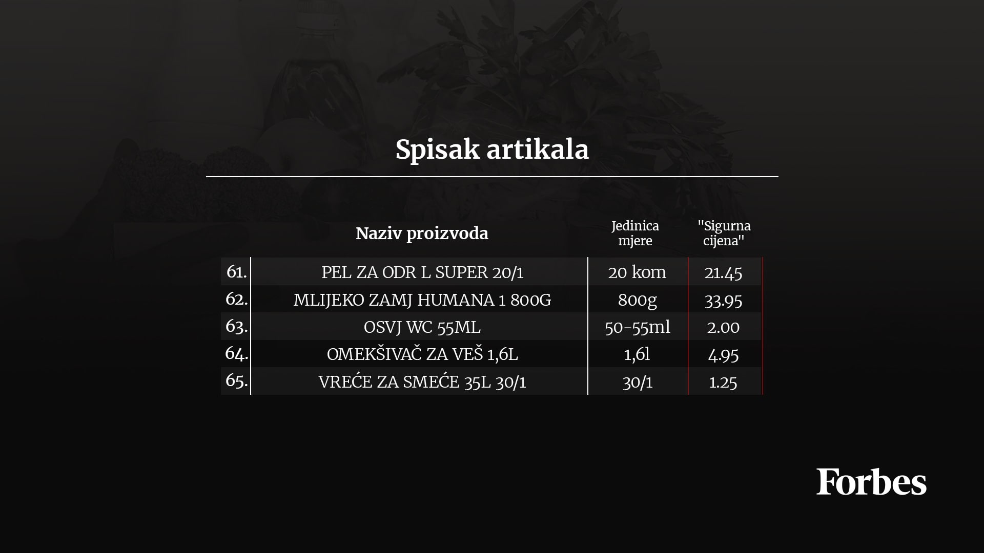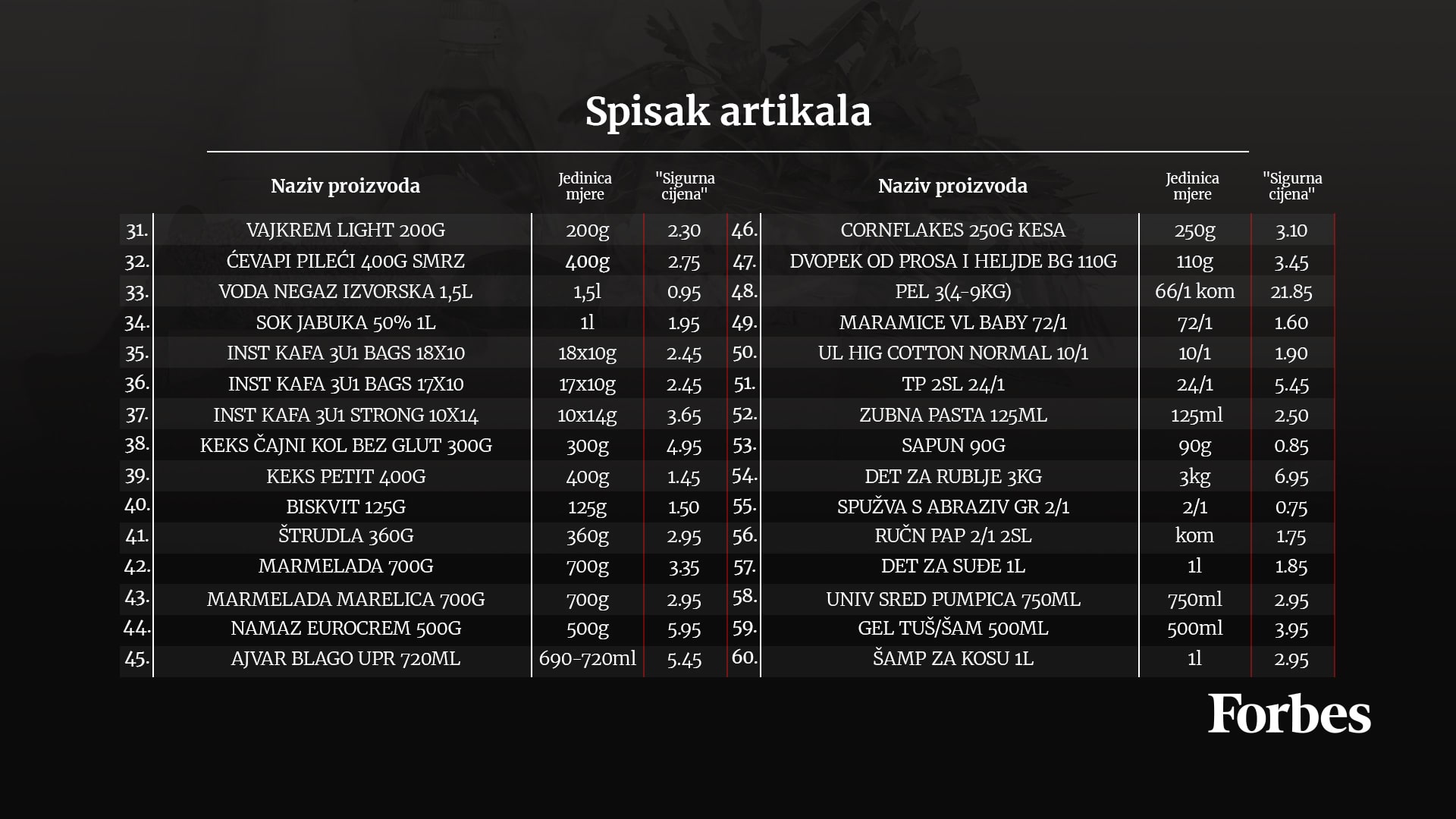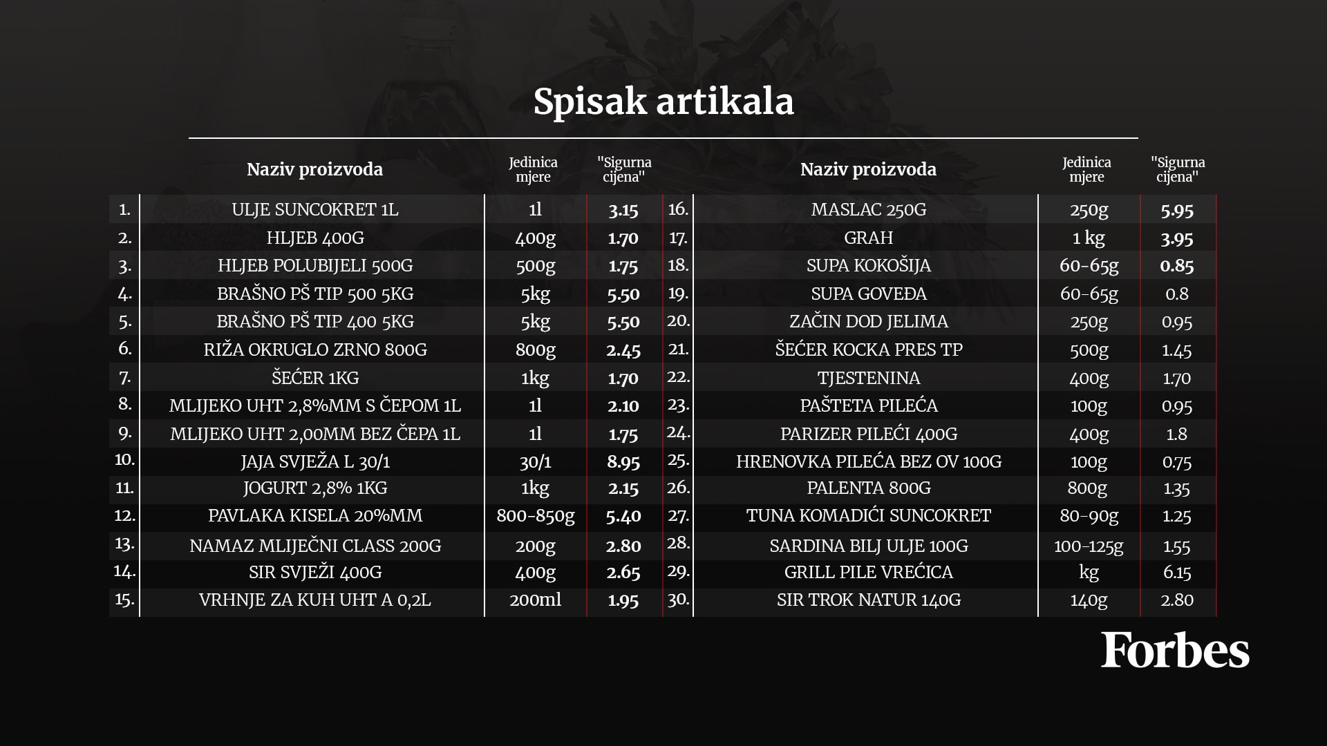 U ovoj fazi projekta izostavljeni su proizvodi čije cijene svakodnevno rastu na svjetskom tržištu, poput kafe naprimjer. Na spisku nema ni majoneze, kao ni putera, proizvoda koji su često u upotrebi. Također nema ni čokolade, omiljene slastice za najmlađe.