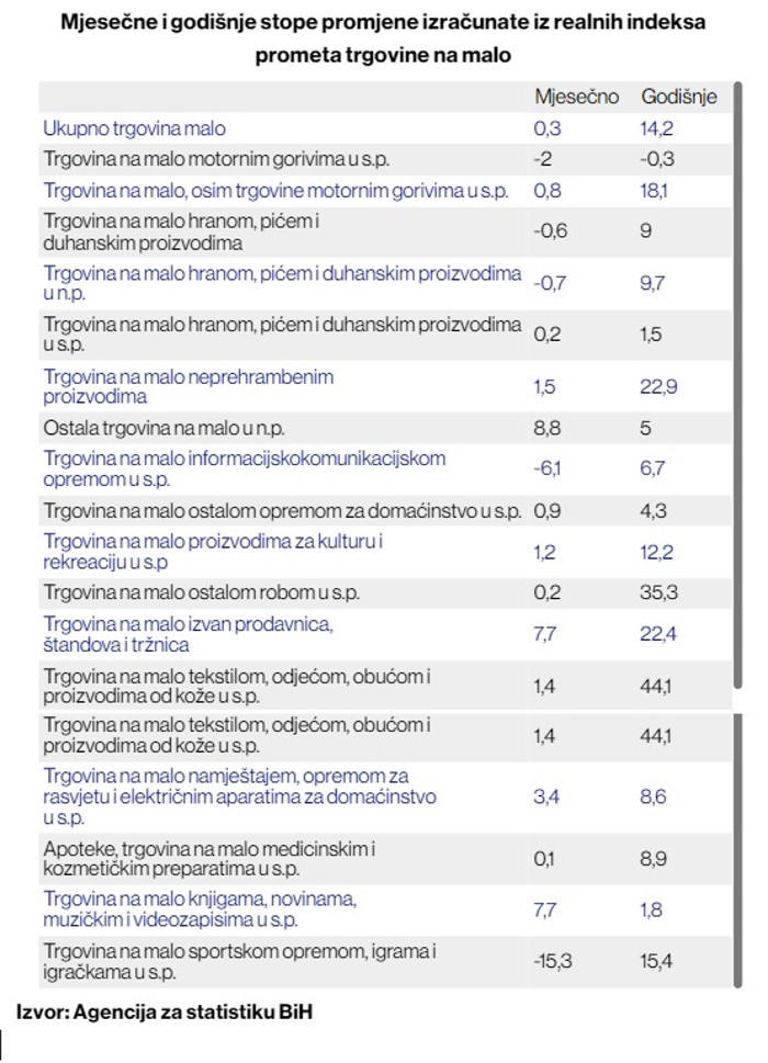 Na godišnjem nivou trgovina u Bosni i Hercegovini i dalje pokazuje izuzetnu otpornost te bilježi dvocifrene stope međugodišnjeg rasta, pokazuju podaci Agencije za statistiku BiH.