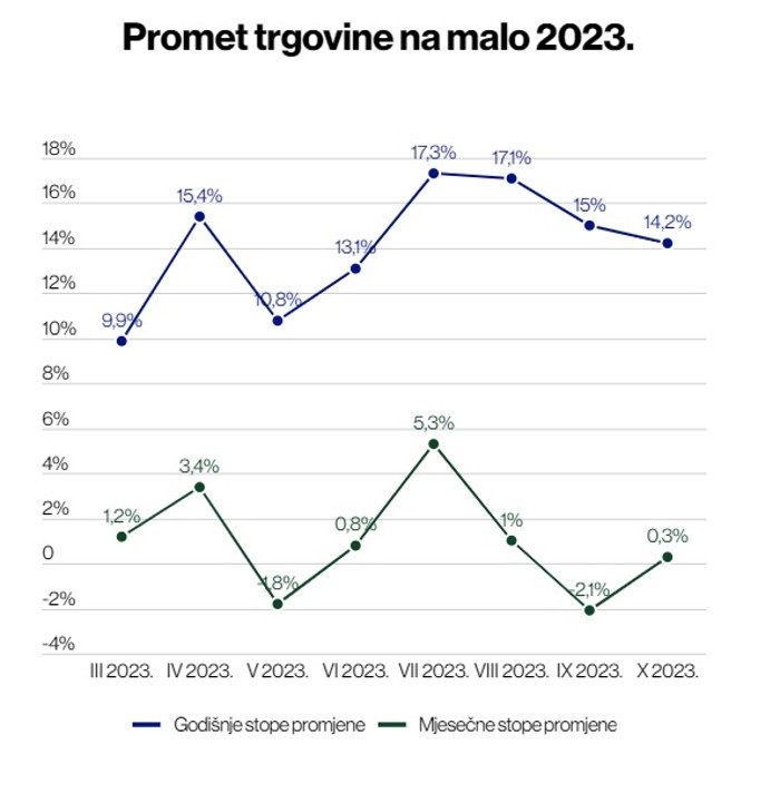 Na godišnjem nivou promet prehrambenim proizvodima porastao je za devet posto, dok je promet neprehrambenim proizvodima ostvario rast od 22,9 posto u odnosu na oktobar 2022. godine.