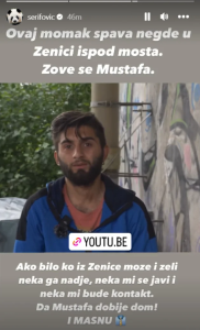 “Ovaj momak spava negdje u Zenici ispod mosta. Ako bilo ko iz Zenice može i želi neka ga nađe, neka mi se javi i neka mi bude kontakt. Da Mustafa dobije dom. I MAŠNU”, napisala je Marija na svom Instagram storyju.