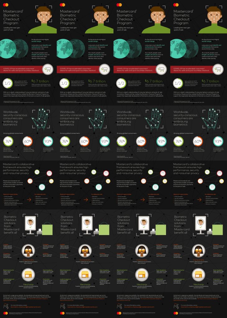 Mastercard je već dugo pionir u korištenju biometrije – u prodavnici i online – kao bezbijednog načina za provjeru identiteta, zamjenjujući lozinku osobom. Ovaj napredak, koji se nadovezuje na EMV 3-D Secure standard, omogućava ljudima da kupuju i plaćaju putem biometrijskih platnih kartica, uređaja i nosivih uređaja. Biometrija je također prisutna u potvrđivanju identiteta online kupaca putem „plaćanja selfijem“ i online, kroz korištenje ključnih standarda kao što je FIDO (Fast Identity Online).