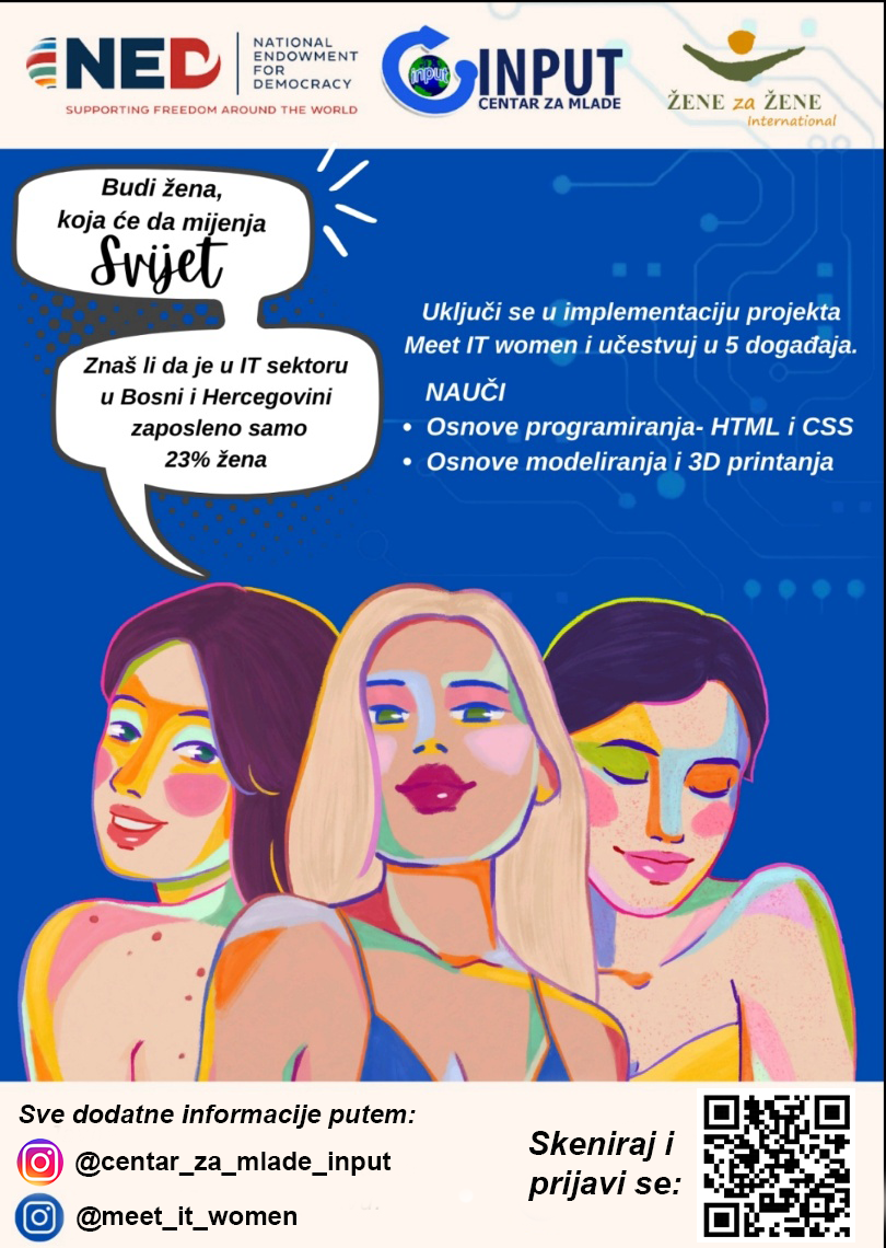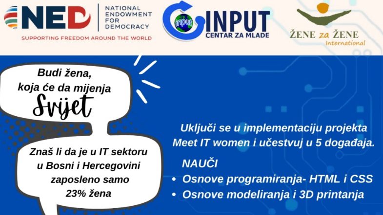 Centar za mlade INPUT u saradnji s volonterkom koja pohađa Akademiju demokratije za mlade žene pod palicom Žene za Žene Internaional i donatorstvom National endowment for democracy – NED sprovodi projekat Meet IT Women gdje će djevojke i žene imati priliku naučiti osnove web programiranja i 3D modeliranja i printanja.