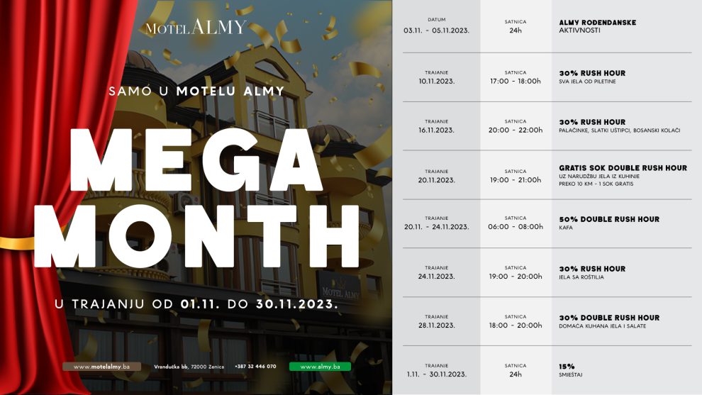 MEGA MONTH u Motelu Almy!- MEGA MONTH U MOTELU ALMY – OD 01.11. DO 30.11.2023. GODINE