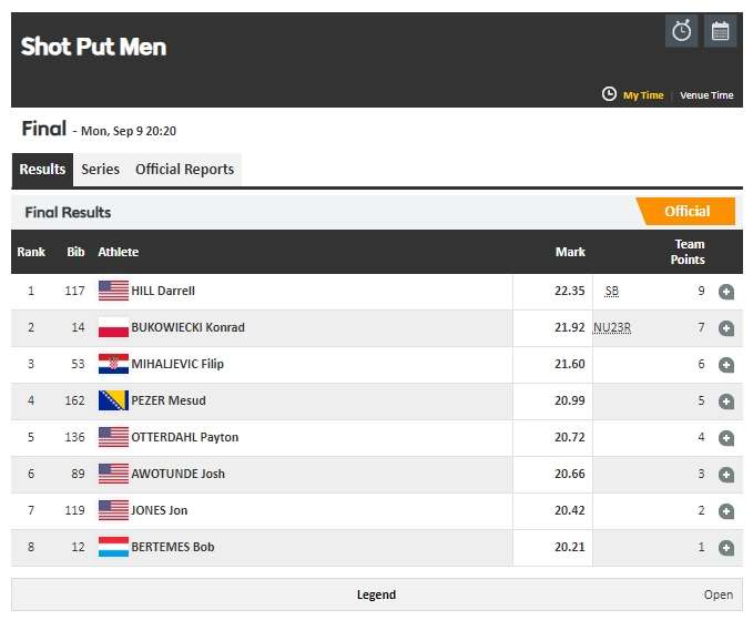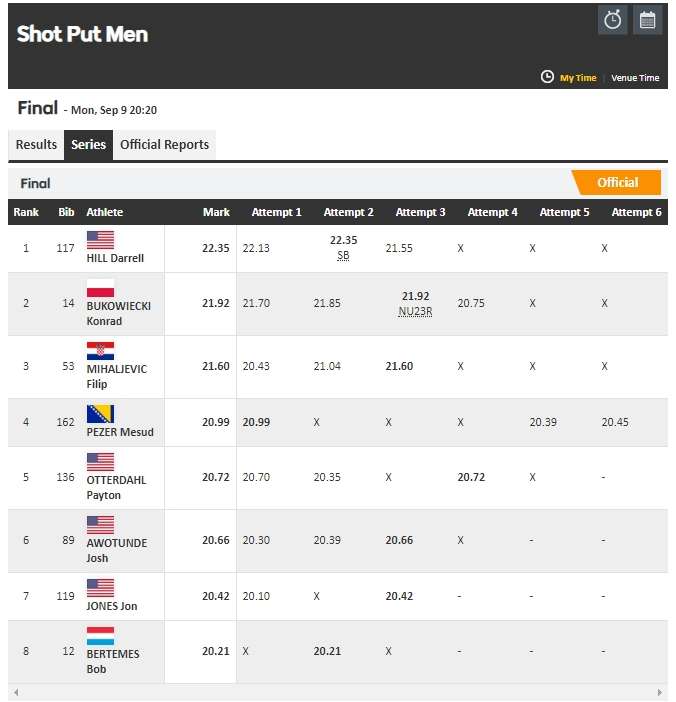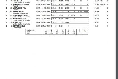 U disciplini bacanje kugle, večeras je nastupao bosanskohercegovački član reprezentacije Evrope Mesud Pezer, čiji je najbolji hitac završio na daljini od 20,99 m što je bilo dovoljno da osvoji četvrto mjesto.