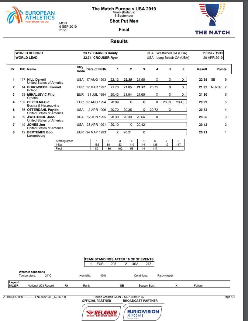 Konačan rezultat atletskog meča reprezentacija Evrope i Sjedinjenih Američkih Država znaćemo sutra nakon što se završi takmičenje u svim predviđenim takmičarskim disciplinama.