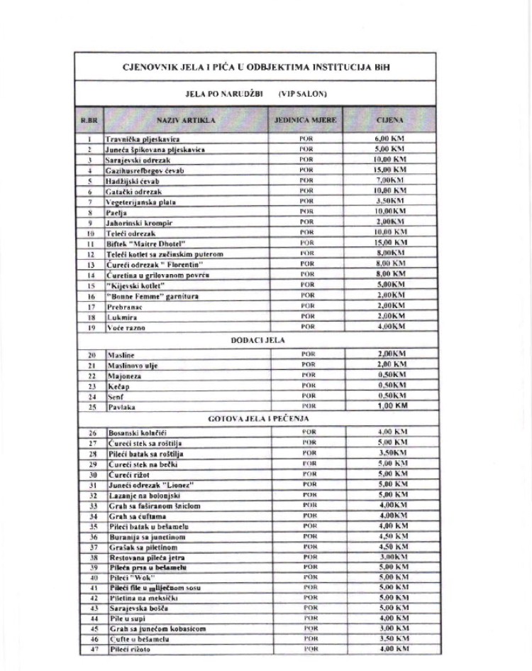 Cijene jela i pića u restoranu smještenom u Parlamentarnoj skupštini BiH nisu mijenjane 10 godina, međutim uskoro bi mogle da rastu, pa će političari koji požele tu jesti, teleće pečenje umjesto 5,5 KM plaćati “čak” 6,5 KM.