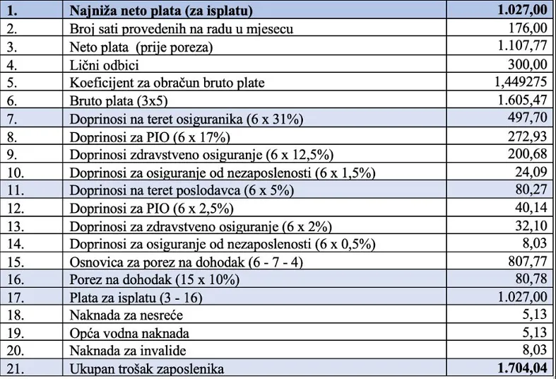 Prema njihovim podacima, ukupan trošak za poslodavca po radniku na minimalnoj plati iznosi 1.704,04 KM.