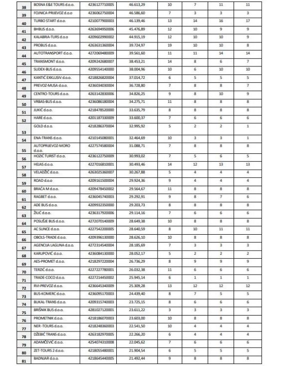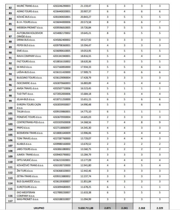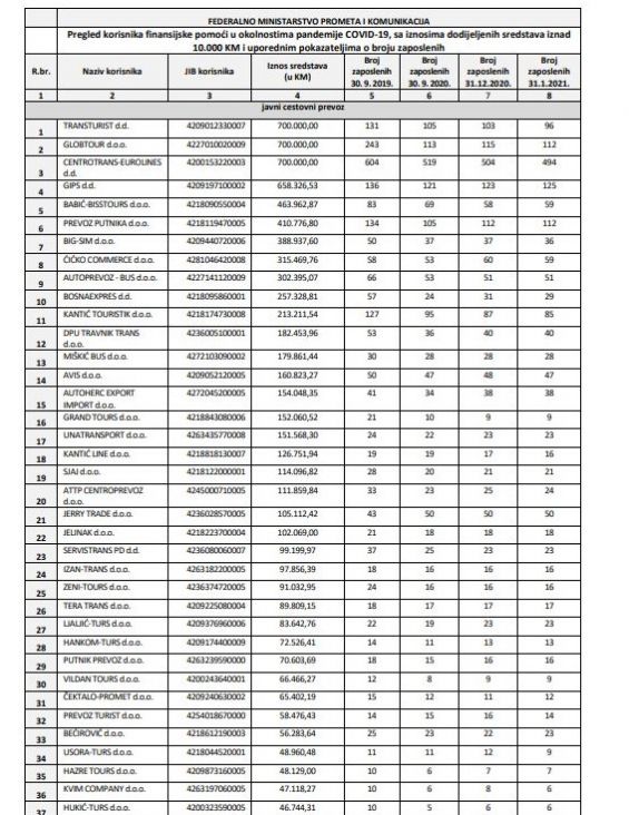 Primjerice kod kompanija koje su dobile pozamašna sredstva Vlade FBiH „Centrotrans-Eurolines“ d.d. Sarajevo (700.000 KM), „Transtourist“ d.d. Tuzla (700.000 KM), „Babić Bistours“ d.o.o. Zenica (463.963 KM), „Autoprevoz-Bus“ d.o.o. Mostar (302.395 KM), Kantić Touristik d.o.o. Tešanj (213.211 KM) i „Kantić Line“ d.o.o. Tešanj (126.752 KM) revizori su utvrdili manji broj zaposlenih!?