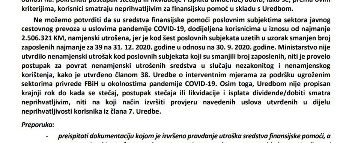 “Ne možemo potvrditi da su sredstva finansijske pomoći poslovnim subjektima sektora javnog cestovnog prevoza u uslovima pandemije COVID-19, dodijeljena korisnicima u iznosu od najmanje 2.506.321 KM, namjenski utrošena, jer je kod šest poslovnih subjekata uzetih u uzorak smanjen broj zaposlenih najmanje za 39 na 31. 12. 2020. godine u odnosu na 30. 9. 2020. godine”, podvlače revizori, te zaključuju:
