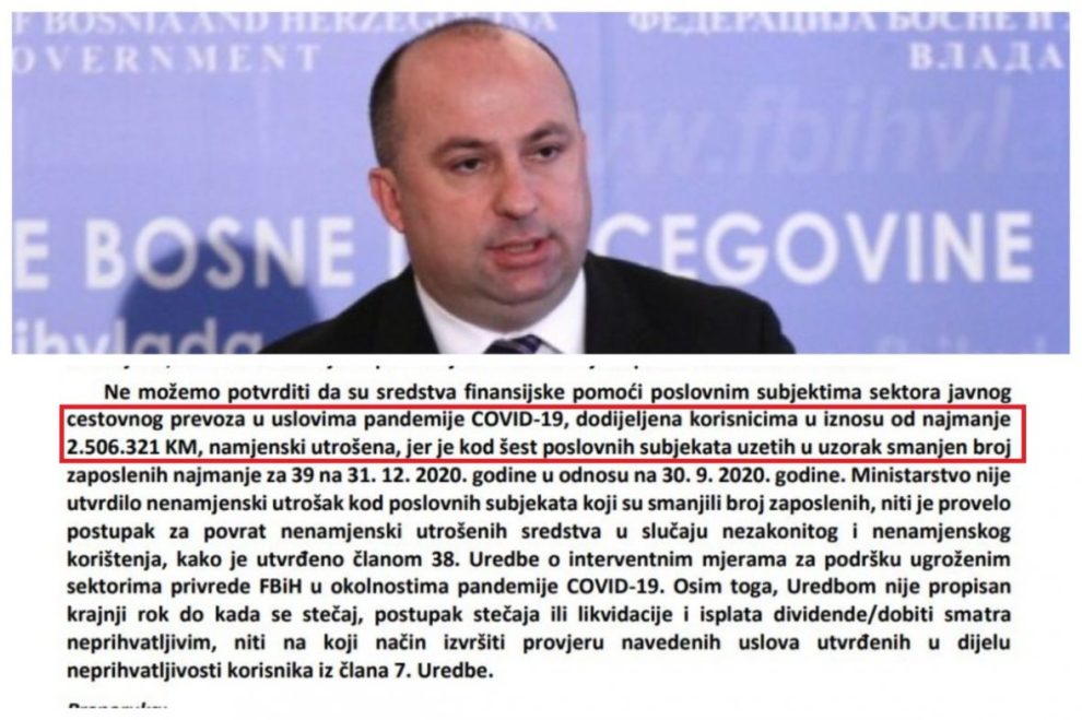 Federalni revizori dali su „mišljenje s rezervom“ Federalnom ministarstvu prometa i komunikacija nakon što su, uz ostalo, prilikom nadzora konstatirali da ovo ministarstvo nije utvrdilo nenamjenski utrošak odobrenih sredstava finansijske pomoći poslovnim subjektima sektora javnog cestovnog prevoza u uvjetima pandemije COVID-19, niti je provelo postupak povrata za najmanje 2.506.321 KM kod poslovnih subjekata koji su smanjili broj zaposlenih na 31. decembar 2020. godine u odnosu na 30. septembar iste godine.