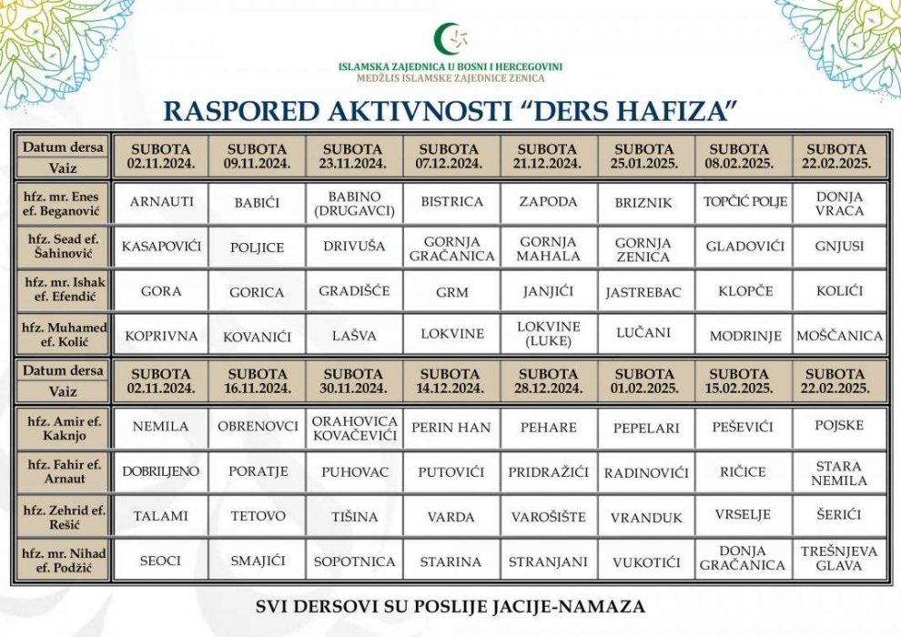 Ders hafiza će se održavati u džematima po određenom rasporedu, a tribina “Muhamed Seid Serdarević” će se održavati zadnji petak u mjesecu u Islamskom centru Sultan Ahmed.