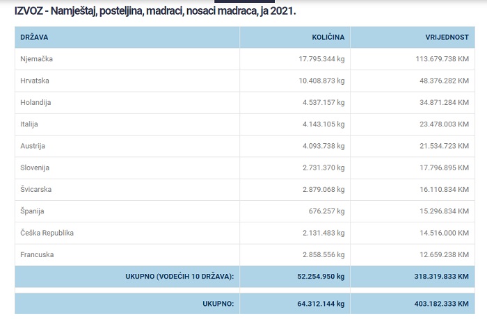 Mjesečni izvoz namještaja premašio 100 miliona KM- Izvoz namještaja, posteljina i madraca iz Bosne i Hercegovine nastavlja rasti. Za četiri mjeseca ove godine taj izvoz za iznosio 403 miliona KM, piše BiznisInfo.