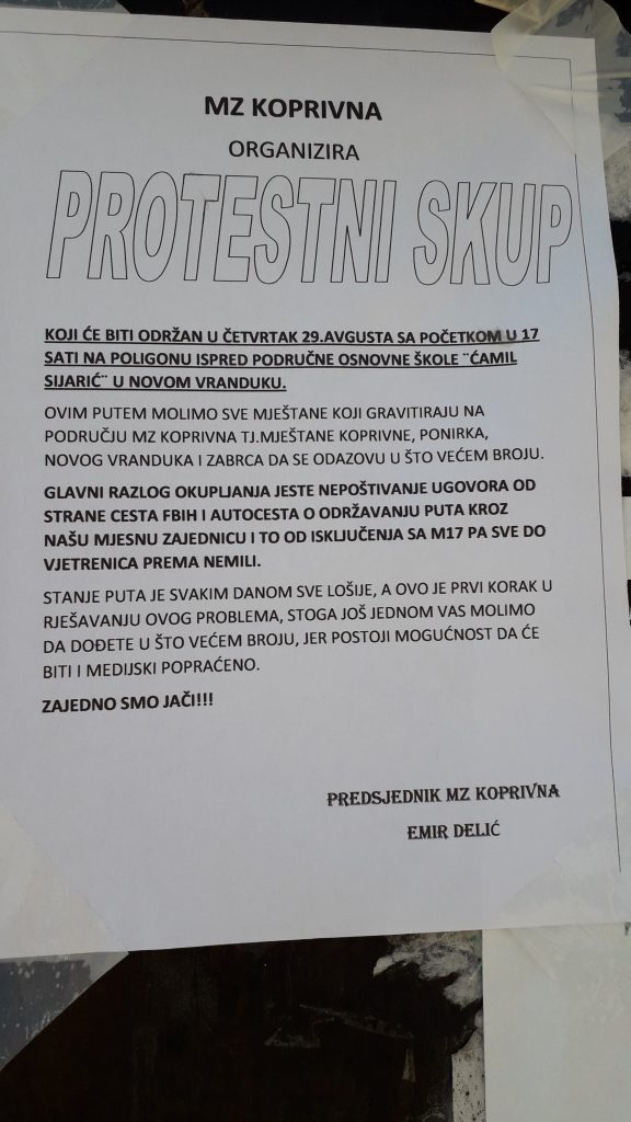-Glavni razlog okupljanja jeste nepoštivanje ugovora od strane Cesta FBiH i Autocesta o održavanju puta kroz našu Mjesnu zajednicu i to od isključenja sa puta M-17, pa sve do Vjetrenica prema Nemili. Stanje puta je svakim danom sve lošije, a ovo je prvo korak u rješavanju ovog problema -, stoji u obavijesti za ovo okupljanje, koje je potpisao predsjednik MZ Koprivna Emir Delić.
