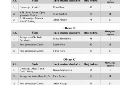 U oblasti A, najbolji su bili Emin Buza (Gimnazija Visoko), Mak Karabeg (KŠC “Sveti Pavao” Zenica), dok je treće mjesto zauzeo Amer Moštro (Gimnazija “Muhsin Rizvić” Kakanj).