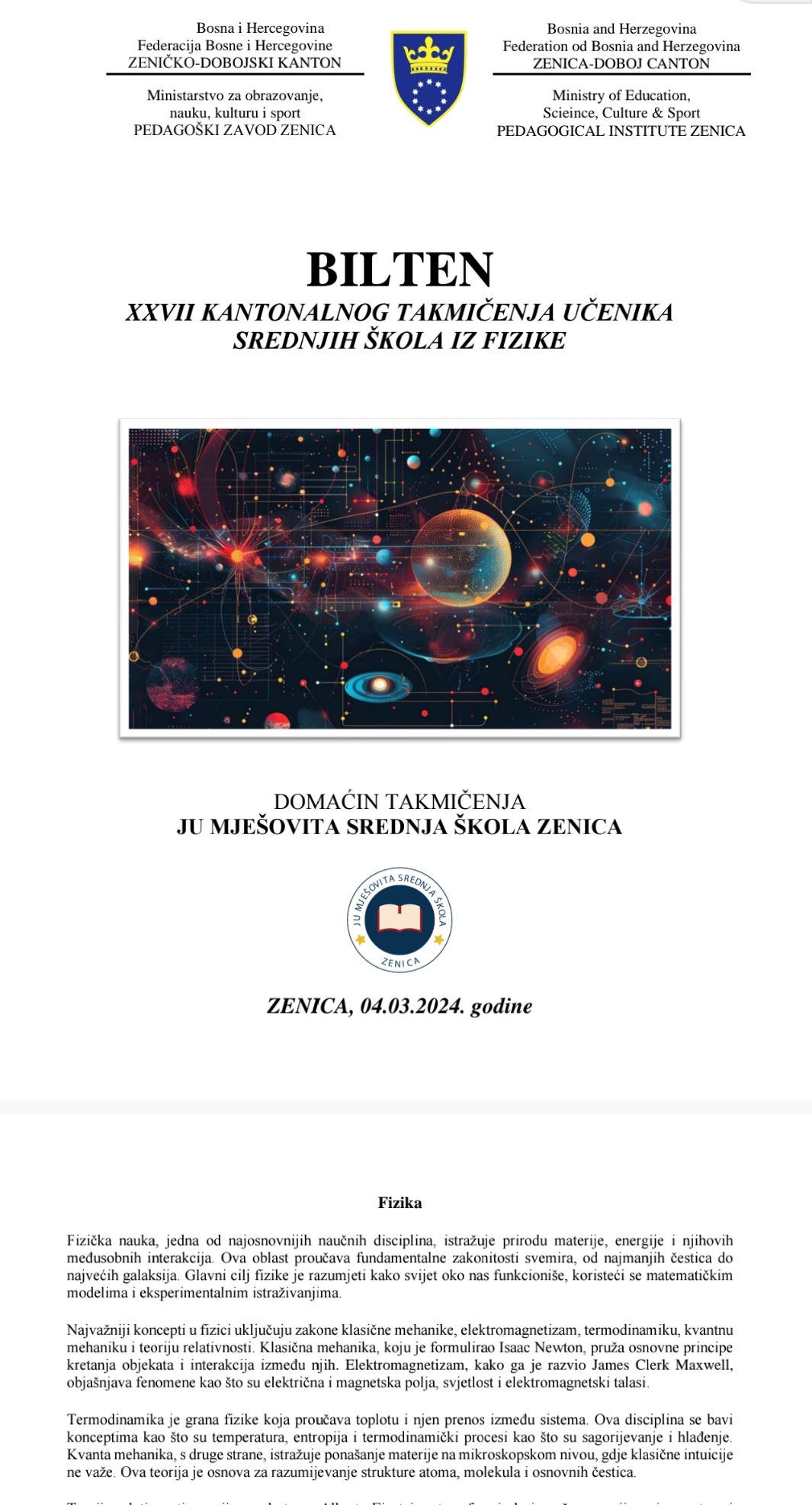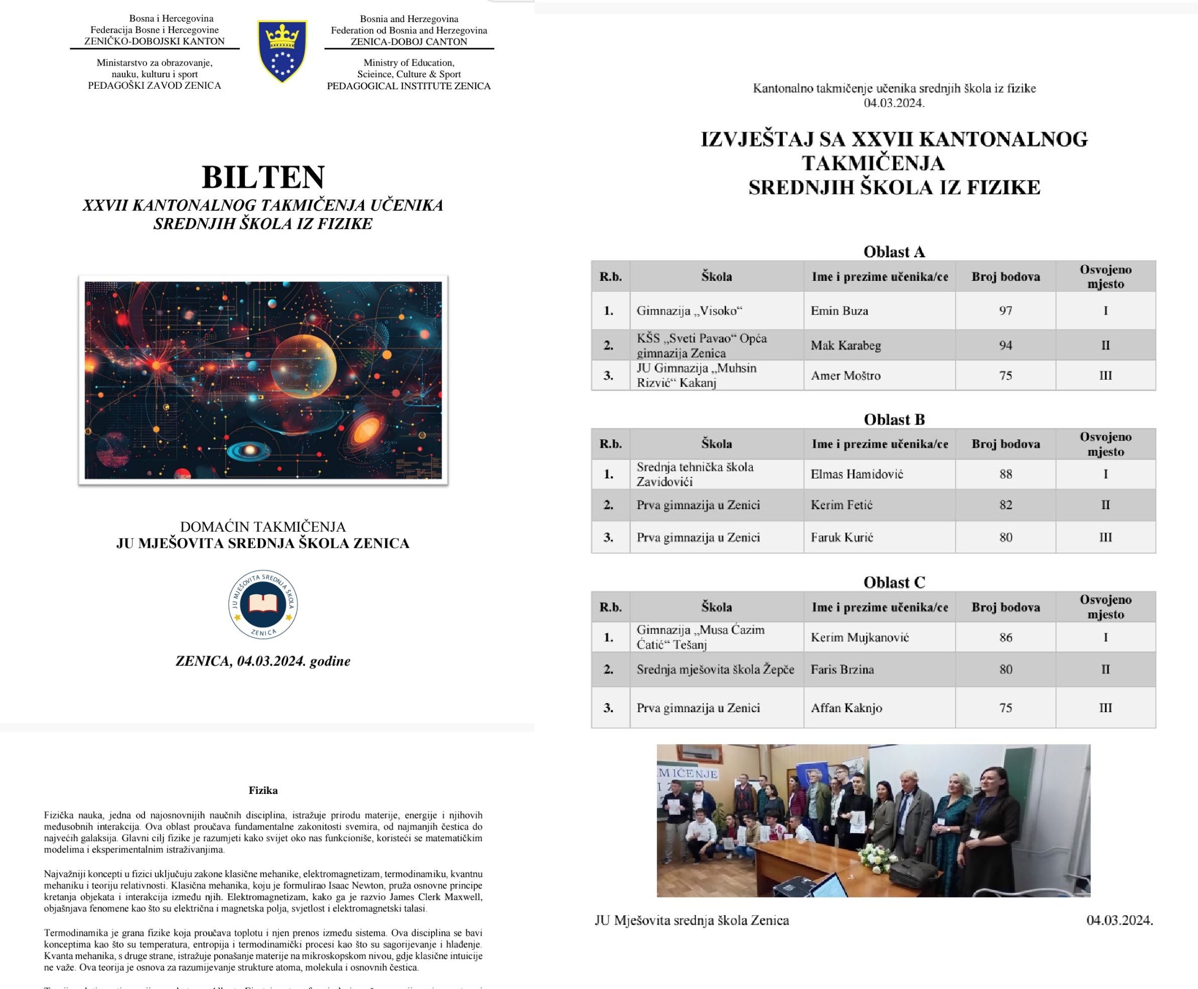 JU Mješovita srednja škola Zenica je bila domaćin XXVII Kantonalnog takmičenja učenika srednjih škola iz Fizike.