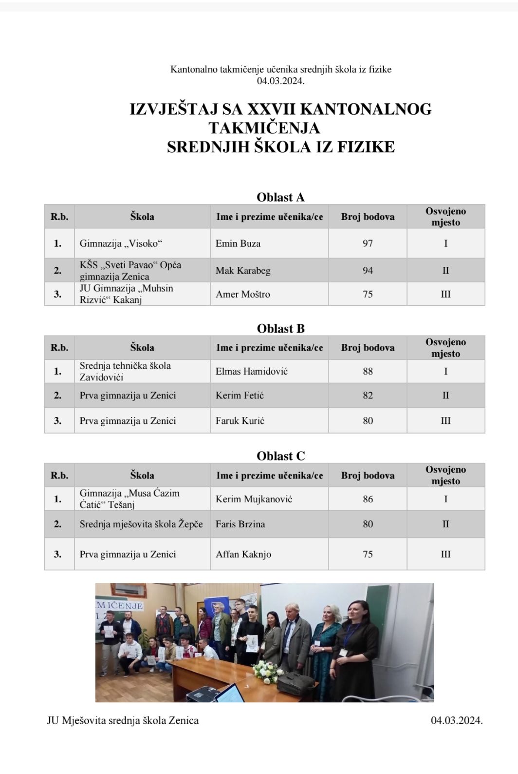U oblasti A, najbolji su bili Emin Buza (Gimnazija Visoko), Mak Karabeg (KŠC “Sveti Pavao” Zenica), dok je treće mjesto zauzeo Amer Moštro (Gimnazija “Muhsin Rizvić” Kakanj).