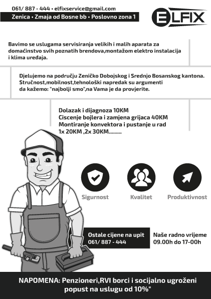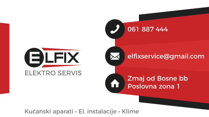 Strategija Elfix servisa je u jednostavnosti i brzini. Svojim klijentima omogućuju komunikaciju i putem VIBERa kako bi ih poštedjeli dodatnih troškova. Posjeduju transportno vozilo i servis za otklanjanje komplikovaniji kvarova.Na Vama je da provjerite i ukoliko vam zatrebaju slične usluge kontaktirate „Elfix“ putem telefona +387 61 887-444 ili ih posjetite u Poslovnoj zoni Zenica 1, u Ulici Zmaja od Bosne bb – Biznis inkubator Zenica.