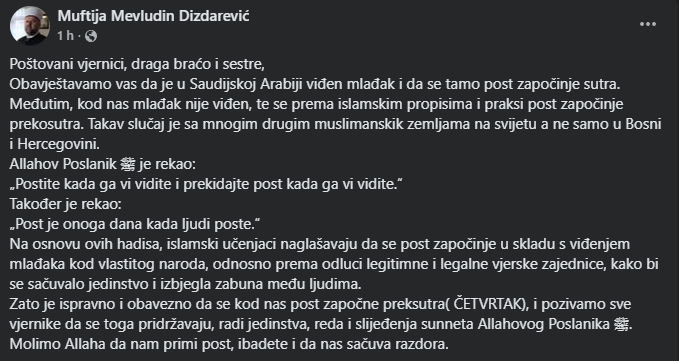 Kako je istaknuto, u Saudijskoj Arabiji potvrđeno je viđenje mlađaka te se u toj zemlji post započinje sutra. Međutim, na području Bosne i Hercegovine mlađak nije viđen, zbog čega se, u skladu s islamskim propisima i ustaljenom praksom, post započinje prekosutra, odnosno u četvrtak.