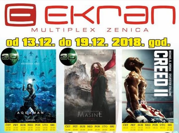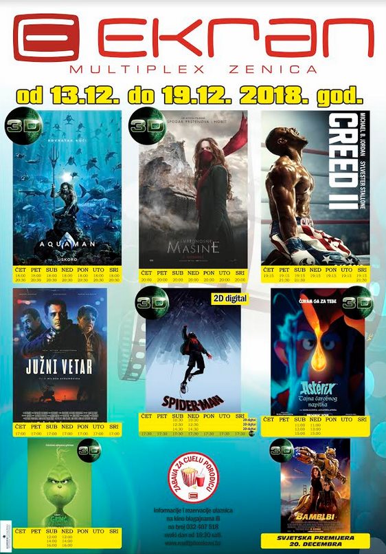Od 13. decembra publiku u Multiplexu “Ekran” Zenica očekuje još jedna itekako atraktivna filmska sedmica. Kada je riječ o novim filmovima, publika će uživati u svjetskoj premijeri filma “AQUAMAN”, fantastičnoj, akcijom nabijenoj avanturi studija Warner Bros. U glavnoj ulozi je Jason Momoa a film je režirao James Wan, poznat po franšizi Prizivanja i Brzi i žestoki. Najmlađa publika će uživati u novom Spider-Man svijetu, te upoznati novi svijet Miles Moralesa koji nam otkriva neograničene mogućnosti Spider-Man svijeta. I u narednoj sedmici prikazuje se film Smrtonosne mašine, Petera Jacksona, reditelja filmova Gospodar Prstenova i Hobit. Također, na programu su i filmovi CREED II, JUŽNI VETAR, ASTERIX I GRINČ, što je svakako dovoljno razloga da publika u vrijeme hladnih, prednovogodišnjih dana uživa u ugodnom ambijentu Multiplexa „Ekran“ Zenica.