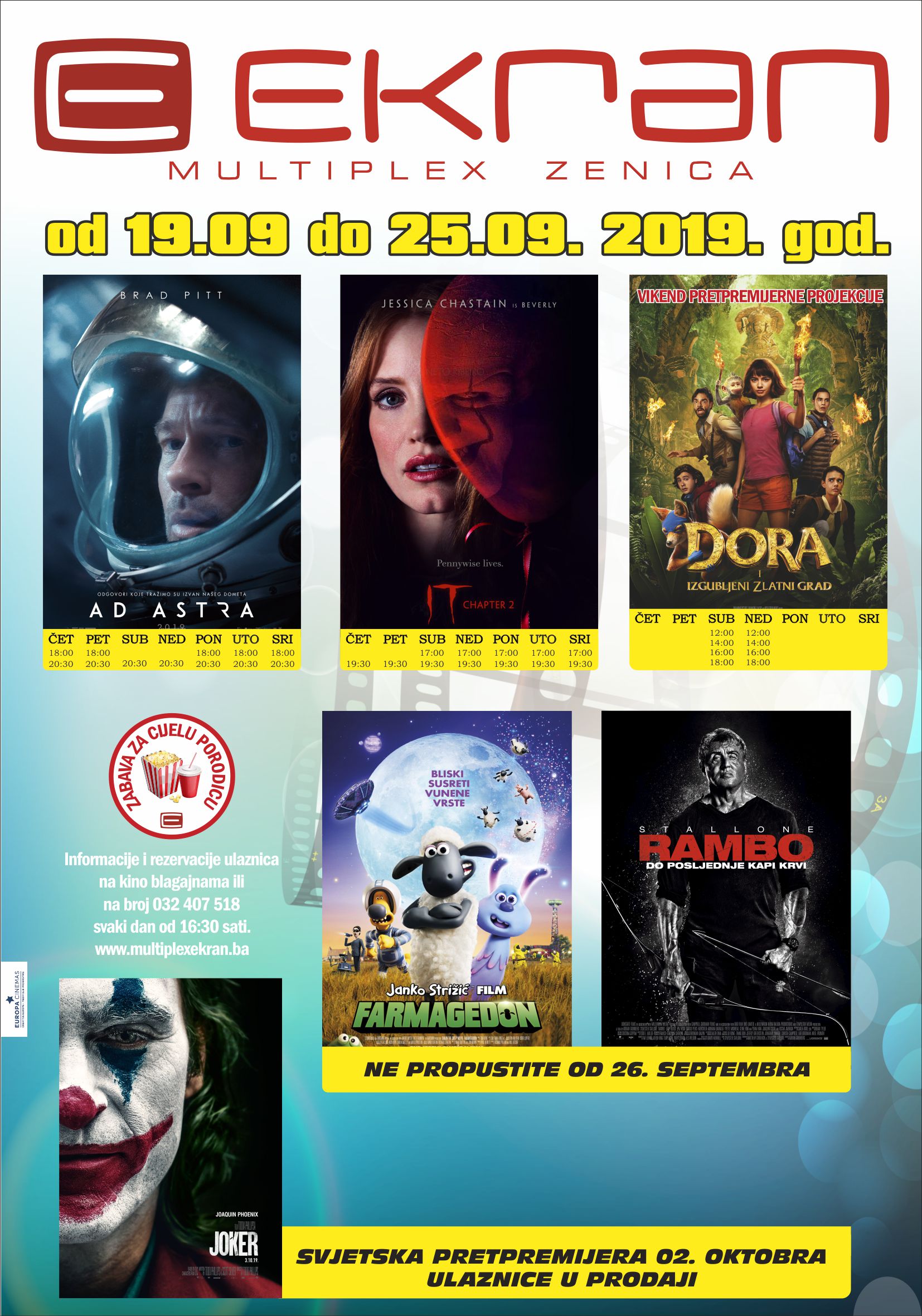 Zbog velikog interesa publike za filmske naslove koji na platna stižu narednih sedmica, Multiplex „Ekran“ Zenica će nastaviti s radom do 31. oktobra. Tako publiku već od četvrtka očekuje SF Triler „AD ASTRA“ u kojem igraju Brad Pitt i Tommy Lee Jones