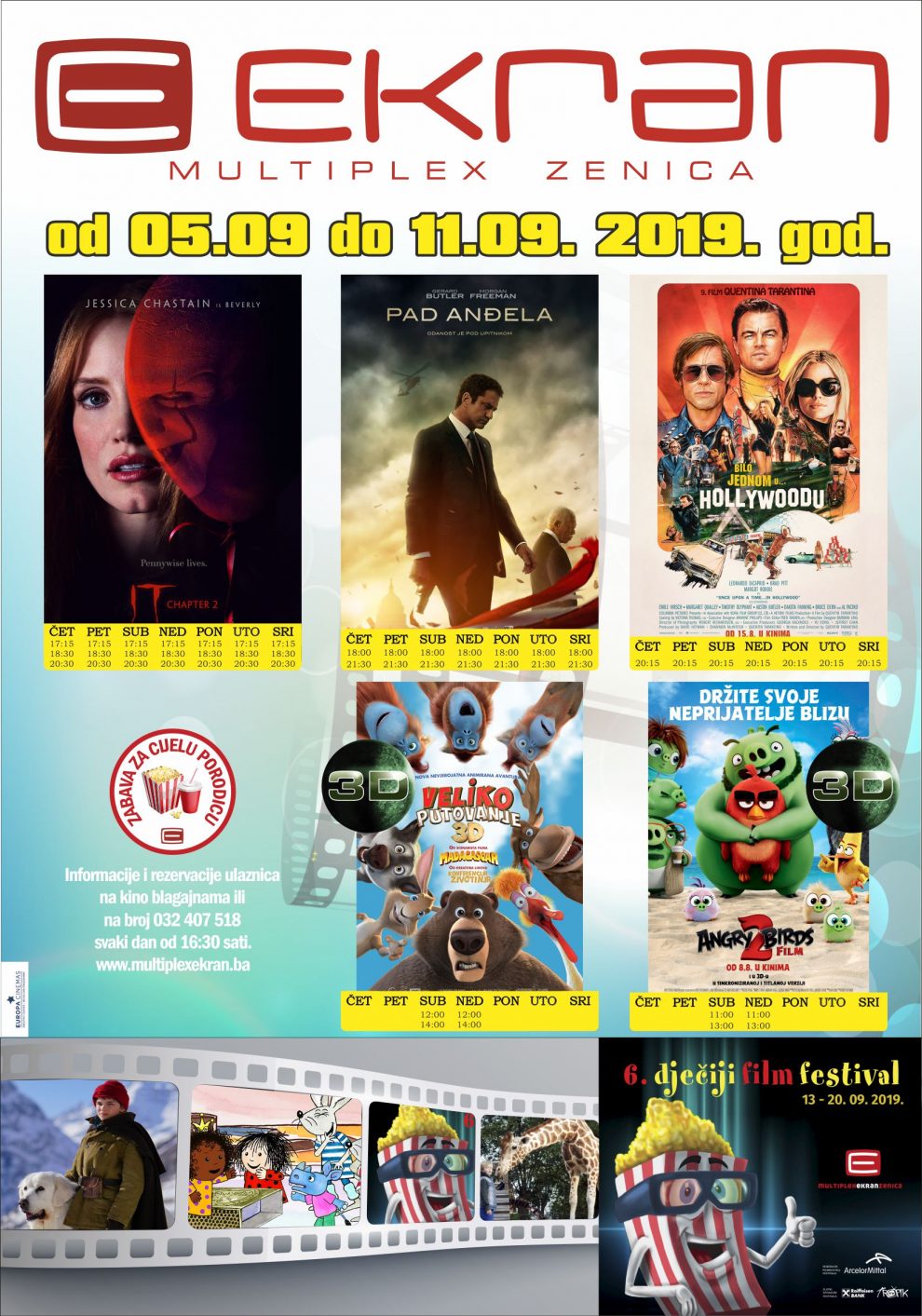 Kako se zlo ponovno vraća svakih 27 godina u grad Derry, Main, ONO: DRUGO POGLAVLJE spaja likove koji su otišli svojim putem nakon gotovo tri desetljeća. Osim dugoočekivanog horora, publika će uživati i u novom Trantinovom filmu “Bilo jednom u Holivudu”, kao i u filmovima “Pad anđela”, “Veliko putovanje”, te animiranoj avanturi “Angry birds 2”. Najmlađa publika je i u iščekivanju najveće filmske smotre za najmlađe koja traje od 13. do 20. septembra.