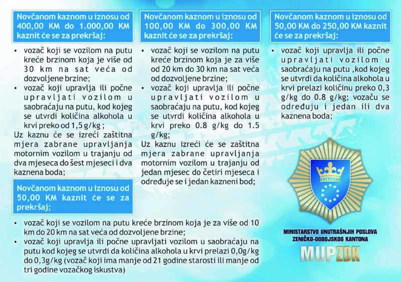 Uprava policije Ministarstva unutrašnjih poslova Zeničko-dobojskog kantona će nastaviti sa aktivnostima na postizanju visokog stepena bezbjednosti odvijanja saobraćaja na području Zeničko-dobojskog kantona, te u tom smislu sprovoditi pojačane akcije, u kojim će se sankcionisati svi nesavjesni vozači i drugi učesnici u saobraćaju, zbog kršenja saobraćajnih propisa.