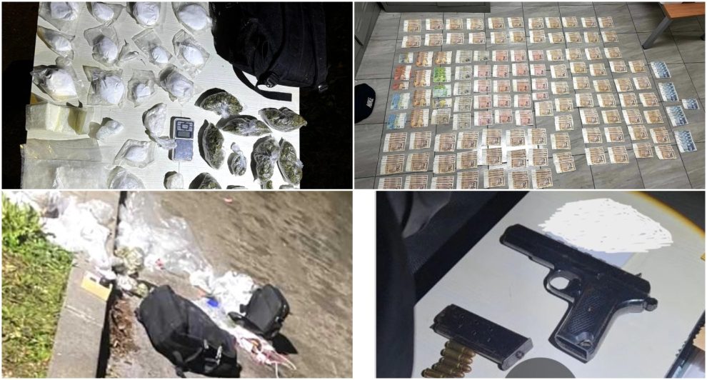 Prilikom pretresanja pronađeni su i oduzeti sljedeći predmeti: 20 pvc pakovanja sa sadržajem bijele materije koja asocira na opojnu drogu “Speed” (za koju je priliminarnim vaganjem utvrđeno da se radi o materiji mase oko 1,5 kg) ukupno 13 pvc. pakovanja sa sadržajem biljne materije koja svojim izgledom asocira na opojnu drogu “Cannabis Sativa” (za koju je priliminarnim vaganjem utvrđeno da se radi o materiji mase oko 0,5 kg), pištolj u repetiranom položaju sa metkom u cijevi i spremnikom za municiju u kojem se nalazi 5 metaka, 2 (dvije) digitalne vage za precizno mjerenje, novac u iznosu 2760 Eura raličitih apoena, 49140 KM različitih apoena, tri mobilna telefona sa sim karticama, GPS uređaj, kao i drugi predmeti koji se dovode u vezu sa zloupotrebom opojnih druga.
