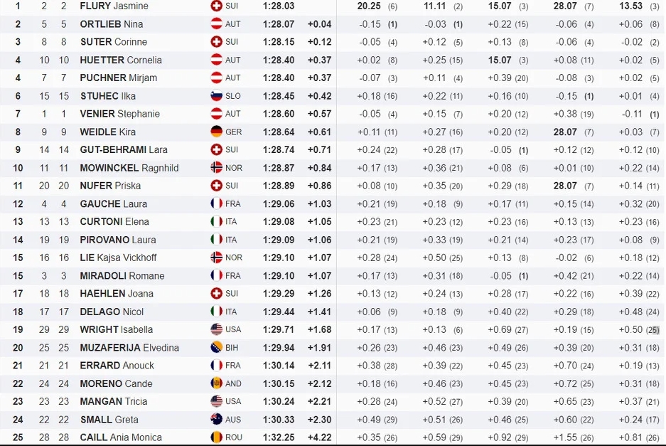 Srebro je otišlo u ruke Austrijanke Nine Ortlieb, koja je imala samo četiri stotinke zaostatka za pobjednicom, dok je još jedan podium za Švicarsku donijela bronzana Corinne Suter s 12 stotinki zaostatka.