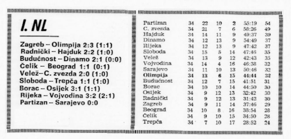 Desetkovani Rođeni, dodatno oslabljeni neigranjem povrijeđenog Džemala Hadžiabdića, nisu se mogli suprotstaviti Romantičarima i poraženi su na Karaburmi (0:2). Da bi na tabeli ostao ispred OFK Beograda, Čelik je u 33. kolu morao izvući pozitivan rezultat na Maksimiru protiv Dinama ili izgubiti s jednim golom razlike. Međutim, dva gola Zlatka Kranjčara i jedan Marka Mlinarića donijeli su ubjedljivu prednost Modrima, a pogodak Peleša za ublažavanje poraza (1:3) nije bio dovoljan Zeničanima.
