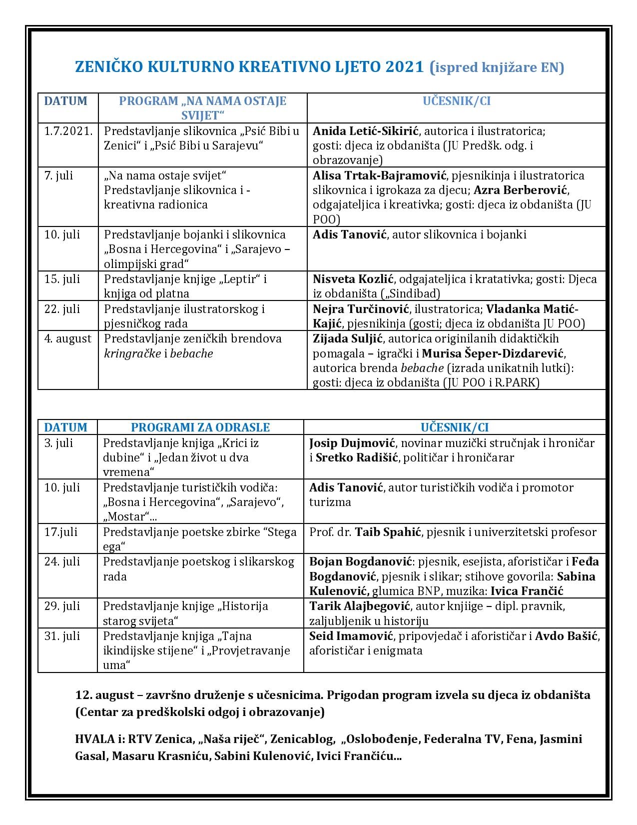 Podršku sam, ponovo, dobio iz svoje matične kuće, Gradske biblioteke. Sa Zuhrom sam dogovorio i okvire za naše programe. Preuzeo sam obavezu da, srijedom ili četvrtkom prijepodne, organizujem programe za djecu. Zuhra se, očekujući i moju pomoć, obavezala da bude domaćin programa koji će biti održavani subotom od 11.00 do 13.00 sati. Željeli smo da u četrdeset dana, koliko smo planirali da traje ovogodišnja manifestacija, predstavimo zeničke kreativce od kojih su neki više posla uradili i poznatiji su u drugim gradovima ili državama nego u svome gradu i svojoj domovini.