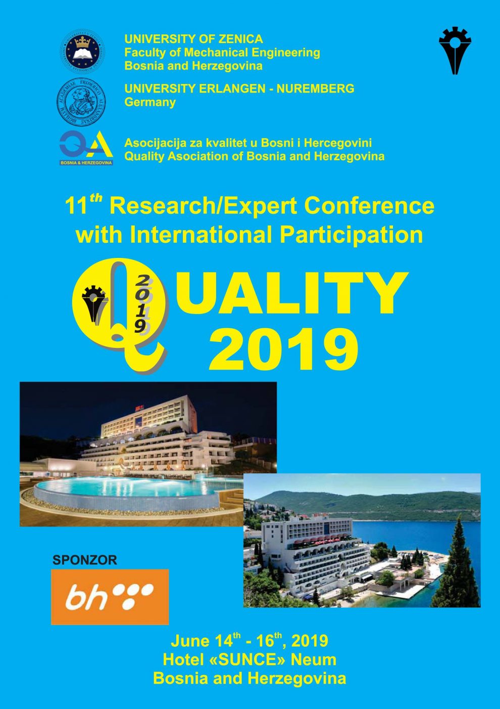 NAJAVA 11. NAUČNO-STRUČNE KONFERENCIJE QUALITY 2019 – Neum 14.-16. juni 2019. – Hotel SUNCE – Mašinski fakultet Univerziteta u Zenici po jedanaesti put organizuje Naučno-stručni skup sa međunarodnim učešćem “QUALITY 2019”, koji će se održati u periodu od 14. do 16. juna 2019. godine u Neumu u hotelu “SUNCE”.